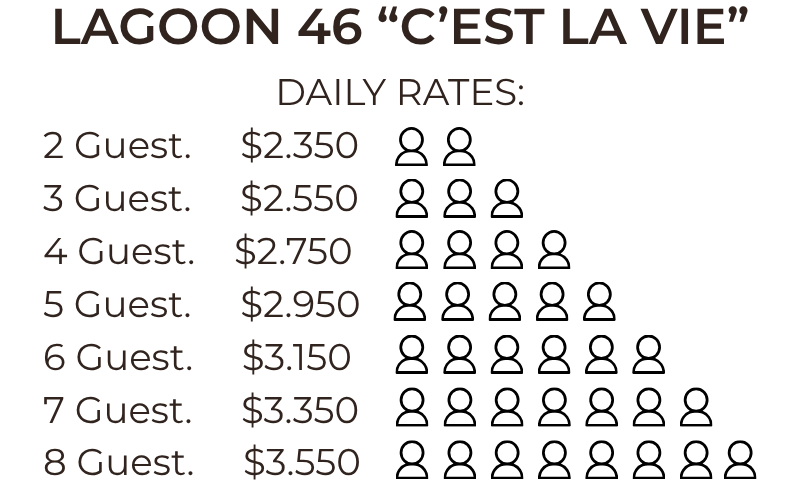 The Lagoon 46 “C’est La Vie” is a contemporary and beautifully engineered catamaran, designed to deliver superior comfort, performance, and long-range cruising capability. With an impressive interior volume and a refined layout, it offers an exceptional balance between open living spaces, privacy, and effortless handling.