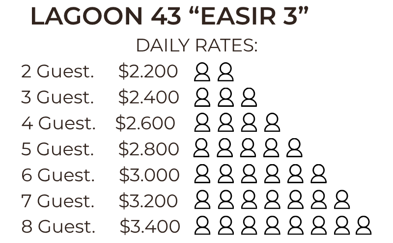 The Lagoon 43 “Easir” is a modern and well-balanced catamaran designed to offer exceptional comfort, stability, and efficiency at sea. With generous interior volume and smart exterior layouts, it provides an ideal combination of space, privacy, and easy handling. The exterior living areas are remarkably spacious for its size.