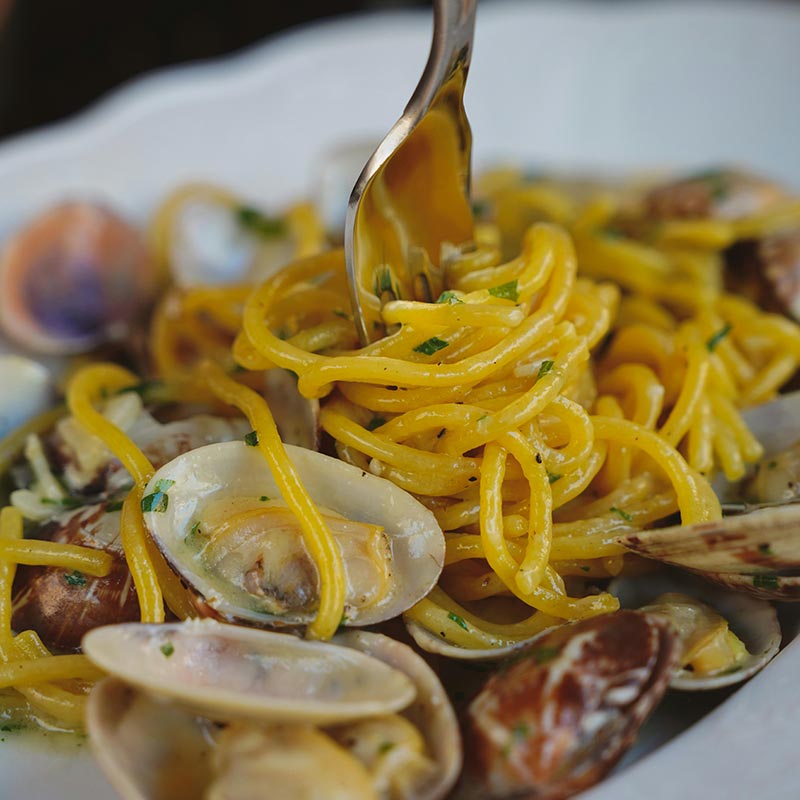 Tagliolini tossed with juicy vongole veraci, gently sautéed in extra virgin olive oil, garlic, and a splash of dry white wine. Finished with fresh parsley, a hint of chili, and a dusting of lemon zest to enhance the sea’s natural brininess. A touch of bottarga or colatura di alici can be added for an extra umami twist.