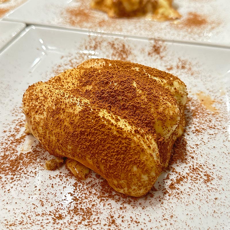 Our Signature Tiramisu: Freshly prepared with authentic mascarpone, espresso-soaked Savoiardi, dark chocolate, and a delicate hint of Caribbean rum. Finished with a dusting of fine cocoa powder — optionally paired with a cup of Italian espresso for an elevated twist on this timeless classic.